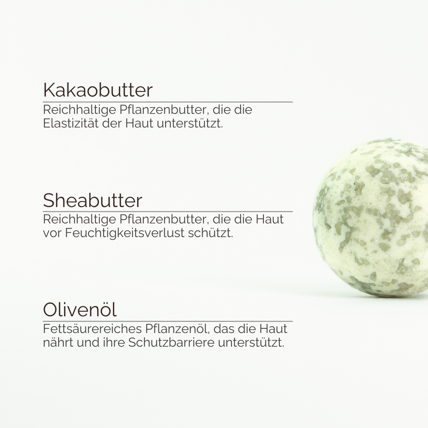 Kakaobutter, Sheabutter und Olivenöl versorgen die Haut intensiv mit Feuchtigkeit und unterstützen ihre natürliche Geschmeidigkeit. Nach dem Bad fühlt sich die Haut weich, gepflegt und angenehm ausgeglichen an, ganz ohne zusätzliches Eincremen.