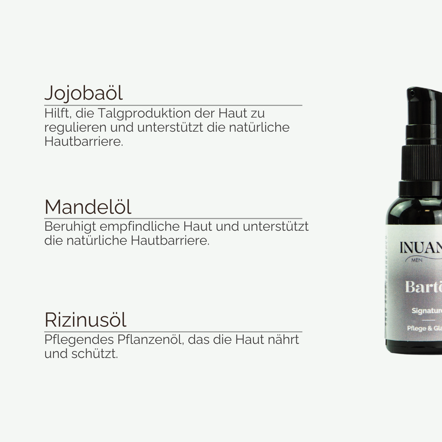 Das Bartöl pflegt den Bart intensiv und versorgt gleichzeitig die Haut darunter mit wertvollen Lipiden. Die leichte Öltextur verleiht dem Bart natürlichen Glanz und Geschmeidigkeit ganz ohne fettiges Gefühl.