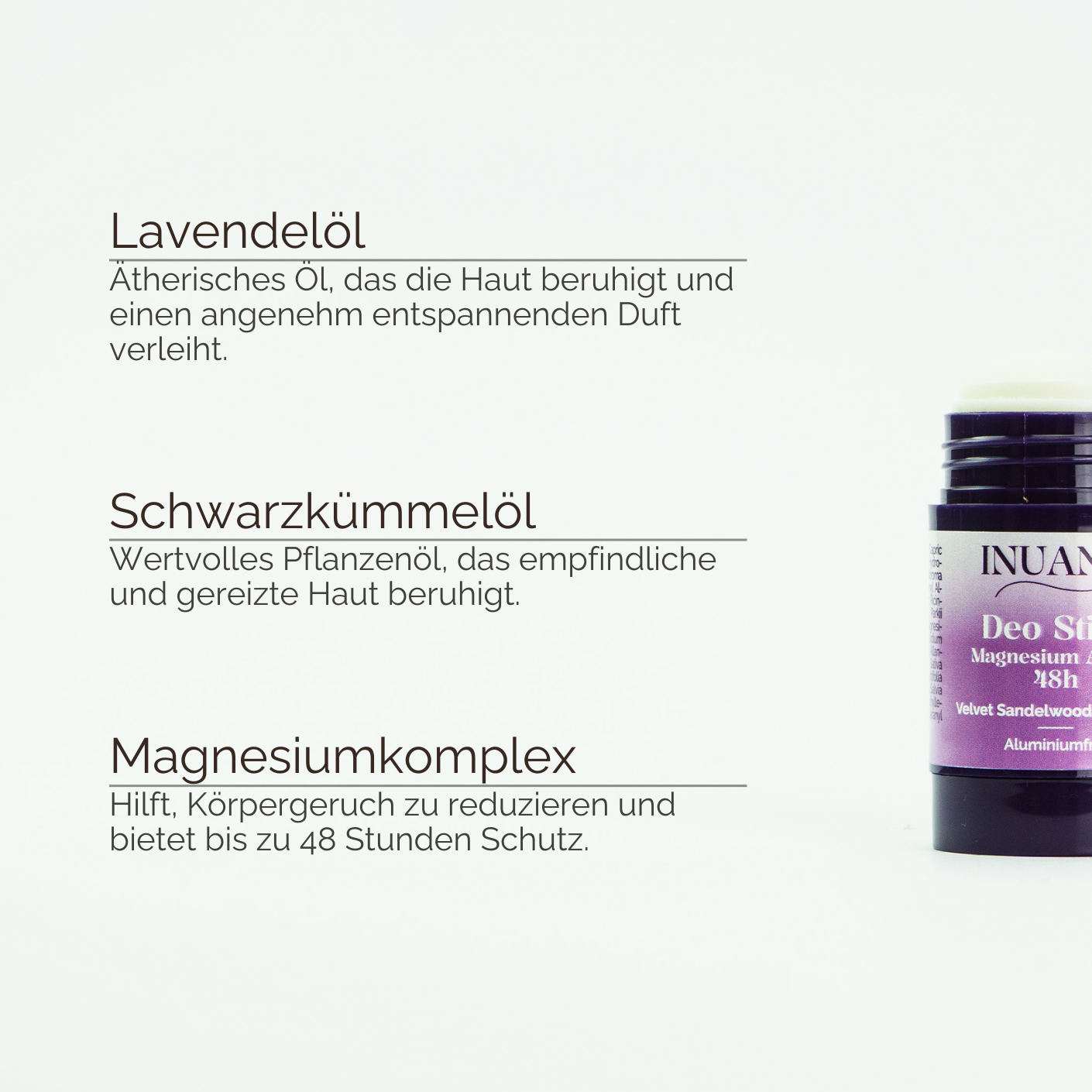 Der Inuana Deo Stick schützt zuverlässig vor Geruch, ohne die natürliche Schweißfunktion zu blockieren. Die magnesiumbasierte Formel neutralisiert Körpergeruch effektiv und das ganz ohne Aluminium und Natron.